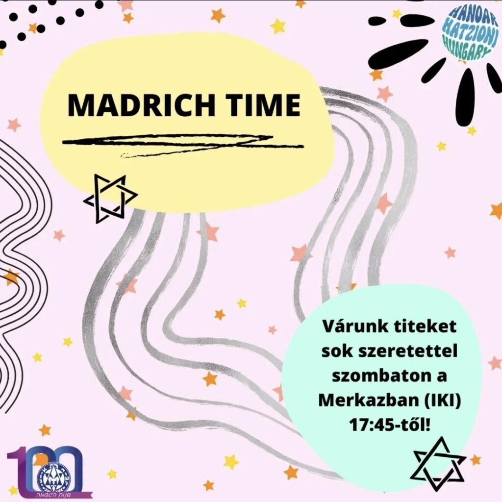 Sziasztok!Ezen a héten a Hanoaros madrichok Madrich time-mal készülnek nektek! Gyertek el, és érezzük jól magunkat együtt! Merkaz D 17:45-től